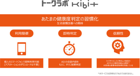 近年では、健康な生活習慣が中高年のエピソード記憶に良い影響え、身体活動が認知機能低下リスクも低減することが分かってきている。「トークラボKIBIT」は、生活者が日常会話を通じて簡単に利用できるあたまの健康度セルフチェックツールとして、生活者が自身の状態を日常的に把握することで健康に関する意識向上を促進。生活習慣改善や健康寿命の延伸に貢献することを目的としている。