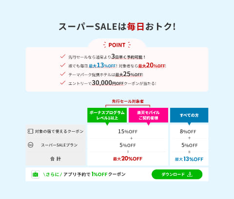 今回のセールでは、国内の宿泊施設を対象に20,000点以上のお得な宿泊プランを提供するほか、セールプランと割引クーポンを組み合わせることで、2026年8月までの国内宿泊が最大20%オフで予約できます。