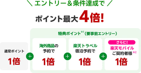 楽天トラベル観光体験では、最大1,500円オフクーポンを配布。エントリーと条件達成でポイント最大4倍になるキャンペーンも実施します。通常ポイントが1倍、宿泊予約で1倍、海外商品の予約で1倍、楽天モバイル契約者で1倍の計4倍となります。予約時間(日本時間)は9月4日20時~9月20日23時59分。利用期間(現地時間)は9月4日20時~12月31日23時59分。