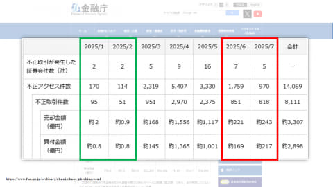 ただ、2025年7月になっても5社の証券会社で970件の不正アクセスが発生。被害額は7月だけで約460億円と、2025年1月の2.8億円の被害額に対して、まだ多額の被害が存在している。