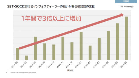 SBテクノロジーのSOC(Security Operation Center)では、2024年6月から2025年6月の1年間で、インフォスティーラーの疑いがある検知数が3倍以上に増加した。攻撃を解析して被害企業などに通報した中で、インフォスティーラーの割合は直近1年間で19%となり、その前年の5%から大幅に拡大したという。
