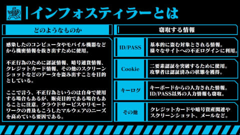 急拡大しているインフォスティーラーは、情報窃取型マルウェアとされ、認証情報、認可情報などの機密情報を窃取することが目的となる。こうした認証・認可情報を盗む攻撃は、これまでもフィッシング詐欺などがあり、証券口座乗っ取りでも多用されているとみられる。
