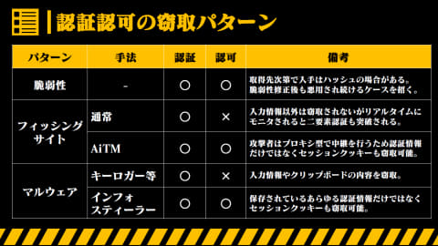 フィッシング詐欺の場合は認証情報(IDやパスワード)を盗むが、AiTM(中間者攻撃)ではプロキシ型の中継によってセッションクッキー(認可情報)の窃取もできる。マルウェアの場合、キーロガーでは認証時のキーボード入力を盗むため認証情報を窃取でき、インフォスティーラーはさらに認可情報も窃取できる。