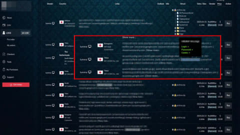 窃取された情報は、さらにダークウェブのマーケットプレイスやTelegramなどで販売される。特定のドメインのアカウントID、パスワード、セッションクッキー(認可情報)が、例えば1アカウント10ドルといった金額で販売されているそうだ。辻氏は、あるマーケットプレイスで日本の証券会社などのアカウントが販売されていることを示し、こうした情報を悪用して乗っ取りが行なわれている可能性を示唆した。