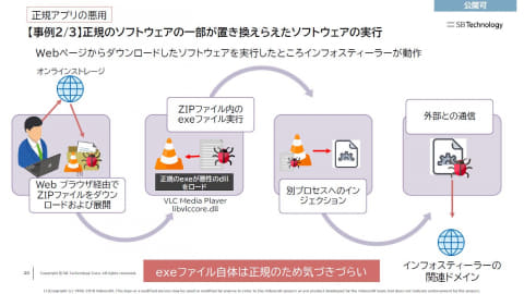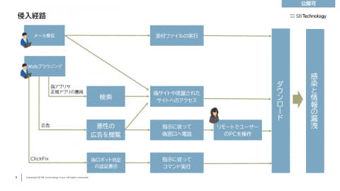 インフォスティーラーの侵入経路について、SBテクノロジーのSOC セキュリティアナリスト鈴木雅人氏はメール・チャットとWeb経由の2つに大別されると説明する。メールの場合は添付ファイルを実行したり、記載されたURLにアクセスしてファイルをダウンロードして実行したりすると感染する。