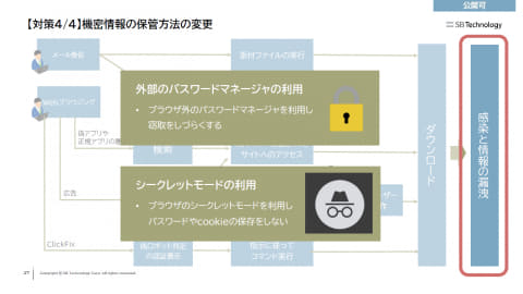 こうした攻撃への対策として鈴木氏は、事業者向けにはネットワークセキュリティ機器の導入や不必要な機能の無効化、従業員教育などを挙げ、さらにブラウザの認証情報を盗むことから、外部のパスワードマネージャーを利用するなどの対策も紹介する。