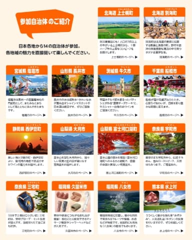 参加自治体は、北海道上士幌町、北海道別海町、宮城県塩竃市、山形県長井市、茨城県牛久市、千葉県船橋市、静岡県西伊豆町、山梨県大月市、山梨県富士河口湖町、奈良県宇陀市、奈良県三宅町、福岡県久留米市、福岡県八女市、熊本県水上村。