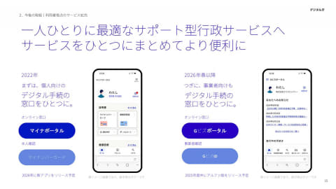 新たなマイナポータルアプリ「マイナアプリ(仮称)」を26年8月を目途に公開予定で、マイナポータルの各機能のほか、本人確認などに使う「デジタル認証アプリ」の機能を統合する。これにより、マイナポータルでの行政サービス利用だけでなく、本人確認の機能も持たせていく。