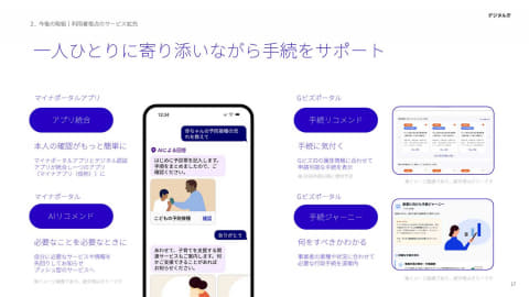 事業者向けの行政サービスも強化。オンライン窓口を既存の「GビズID」から「Gビズポータル」に改め、25年度中にα版を提供開始予定。補助金申請、社会保険手続、各種認可申請などの業務の届出や申請などのオンライン窓口を一元化しながら、使いやすさを向上していく。