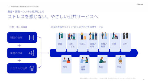 行政サービスのデジタル活用に向けた制度改革や業務改革、システム更新なども進め、「やさしい公共サービス」を目指す。