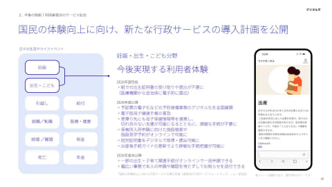 直近では、「妊娠・出生・こども分野」でのサービス向上を予定。2026年度を目処に、紙での出生証明書の受け取りや提出が不要とし、医療機関から自治体に電子的に提出する形にしていく。