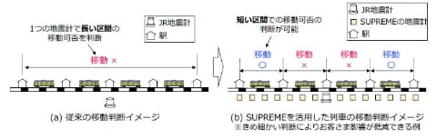 この情報を地震時の運転規制等に活かすため、SUPREMEの地震計情報から沿線の地震動を把握する方法(過去の地震計情報を分析)、沿線のきめ細かい地震計情報から列車が緊急停止した際における移動可否等の判断への活用の検討を進める。