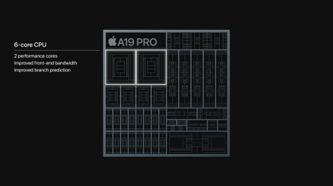チップは「A19 Pro」を搭載。iPhone Airにも同チップが搭載されているが、Proモデルではコア構成が異なる。Airは6コアCPUと5コアGPUを採用しているのに対し、本モデルはCPU・GPUともに6コア構成となっている。