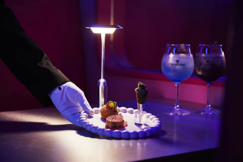 2号車は食堂車をモチーフにしたメインダイニングで、オリジナル料理やドリンクを提供。3号車はバーカウンターやボックス席、“ホーム席”と呼ばれる高架上のテーブルスペースを用意し、よりカジュアルに食事を楽しめる空間とした。