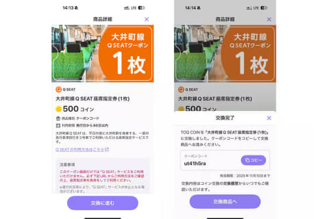 TOQ COINは、東急線の乗車や定期券の購入などで東急線アプリ内にコインを貯められるサービス。貯めたコインは1日乗車券などに交換できる。Q SEATの座席指定券への交換もサービス開始当初から計画されていたが、9月11日のアプリアップデートにより実装された。
