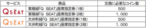 東急線アプリのアップデートにより、「TOQ COIN」サービスで貯めたコインを有料座席指定サービス「Q SEAT」の座席指定券に交換できるようになった。必要なコイン数は500コイン。座席指定料金は大人・小児一律。