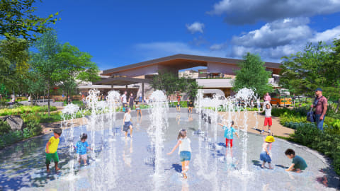 アウトレットゾーン1F 中央のキッズパークには幅広い年齢層に対応可能な遊具を設置。キッズゾーンに面して、有料の室内遊び場である「スキッズガーデン」も出店予定。