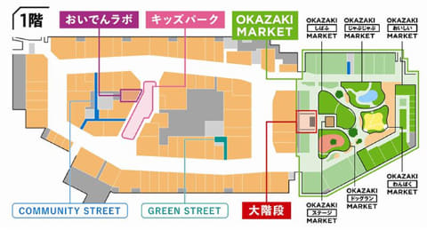 施設は157店舗が揃うアウトレットゾーンと、食関連店舗を中心とした23店舗が出店する「OKAZAKI MARKET」から構成。両ゾーンは大階段によって相互接続され、ゾーンを行き来しながら買い物を楽しめる。