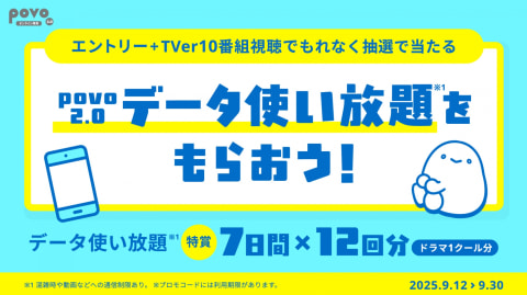 民法が放映した番組コンテンツを無料で配信するTVerは、番組を視聴することで、povo2.0のデータ使い放題プロモコードが必ずもらえるキャンペーンを開始した。応募締切は9月30日23時59分まで。