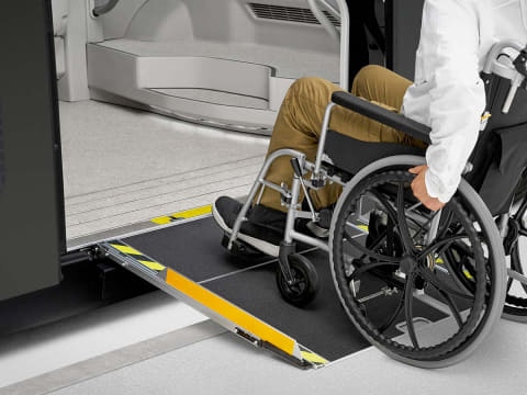 低床、大開口スライドドアを採用しており、短時間で乗降可能。車高調整機能で低床を実現し、電動スロープにより、歩道高さ15cmの場合、車いすの人が介助なく自力で乗降できる。車いすのワンタッチ固定などオプションも装着可能。