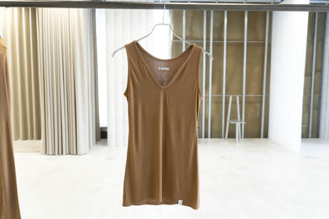 Vネックノースリーブインナーも広めの襟ぐり、長めの着丈を採用。肩幅を狭めに設定しているため、袖がシアー素材のアイテムのインナーとしても着用できるとしている。価格は5,000円(税別)。