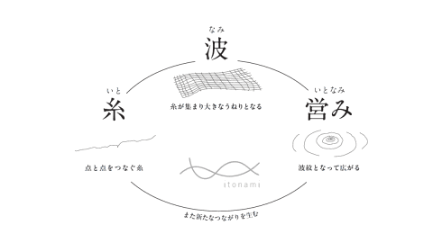 新たに決定した名称「itonami」は、「糸・波・営み」という3つの意味を重ねた言葉。糸は「人や自然、暮らしの要素をつなぐ象徴」、波は「糸が重なり合いながら広がっていく様子」、営みは「この地で営まれる日々の暮らしそのもの」を表している。地域の人と、「住み継がれる、暮らし継がれる街」の未来を描きながら、新たなにぎわいを育んでいくことを目指す。