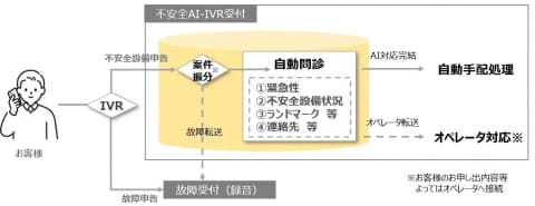今回導入する自動受付システムは、113故障受付に寄せられる声のうち、約3割を占める不安全設備に関する通報が対象。通報者の自由発話に基づいて不安全設備に関する通報かどうかを分類し、AIが緊急性、設備の状態、設置場所などの必要な情報を追加で質問しながら、対応手配へとつなげる。これにより通報から対応までをスムーズに完結させることが可能になる。