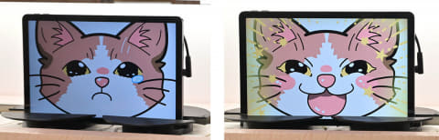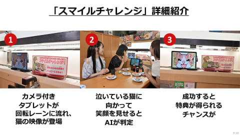 回転レーン上に流れてくる、泣いている猫が映るモニターに向かって笑顔を見せると、AIがその笑顔を判定し、笑顔の度合いに合わせて猫の表情が変化。猫の笑顔を引き出せれば、特典獲得のチャンスを得られる。回転寿司ならではの「目の前を通り過ぎる間に」というドキドキ感を提供するとしている。