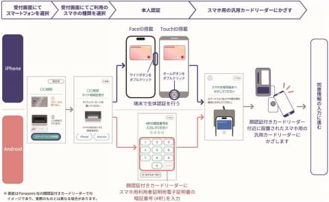 スマートフォンのマイナ保険証利用では、iPhoneのマイナンバーカードと、Androidのスマホ用電子証明書を活用。受付に設置された顔認証付きカードリーダーを操作し、本人認証を行なった後、スマートフォンをスマホ用の汎用カードリーダーにかざす。その後、顔認証付きカードリーダーで同意情報を入力する。