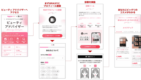 スマホのカメラとAIで診断したユーザーのパーソナルカラーや肌の状態、顔の輪郭などのデータと、ユーザーが登録したプロフィールデータを基に、1人1人に適したコスメを提案するコンテンツ。利用料は無料だが、楽天が運営する美容メディアサイト「RAXY」の会員登録が必要となる。