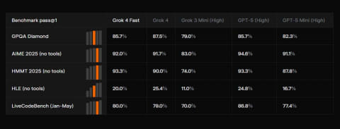 ベンチマークでは、GPT-5 (High)やGrok 4を上回ったり、匹敵するスコアを出している一方で、「Grok 4と同等の最先端ベンチマーク性能を達成するためのコストが98%削減された」としている。