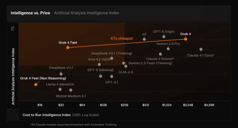 価格は入力トークン100万件で0.2ドル、出力トークン100万件で0.5ドル、キャッシュ済みの入力トークン100万件で0.05ドル。Grok 4 Fastのトークン効率が40%向上し、トークン単価が大幅に低下したため、「リアルタイムアプリケーションに最適」としている。今後は、マルチモーダル機能やエージェント機能などの強化を予定している。