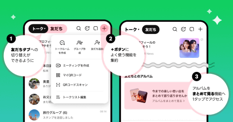 また、「+ボタン」には、「トークルームの作成」や「友だち追加」など、よく使う機能を集約されたほか、「まとめて見る」機能へのアクセスも改善された。これまで複数のトークルームにまたがって作成されていたアルバムを一覧で表示できる機能に、友だちタブから1タップで移動可能になった。