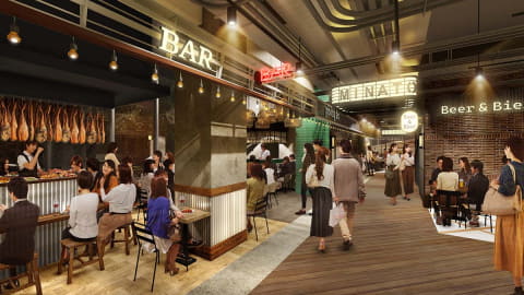 商業エリアには、新業態2店舗を含む55店舗がオープン。そのうち34店舗が国内最大級の小割飲食ゾーンに出店する。同ゾーンの名称は「スタジアム横バル街」に決定した。