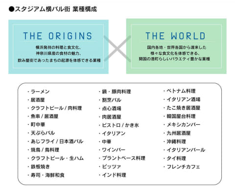 スタジアム横バル街では横浜発祥の料理と食文化、神奈川県産の食材の魅力、飲み屋街であったまちの起源を体感できる業種と、開国の港町らしいバラエティ豊かな業種をかけ合わせた店舗で構成される。