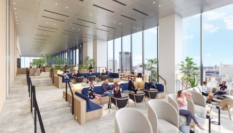 12~33階のオフィスエリアは地域のビジネス拠点としての役割を担い、玄関口でとなる11階のスカイロビーには、ラウンジ、カフェ、コンビニ、シェアオフィスなどを整備する。