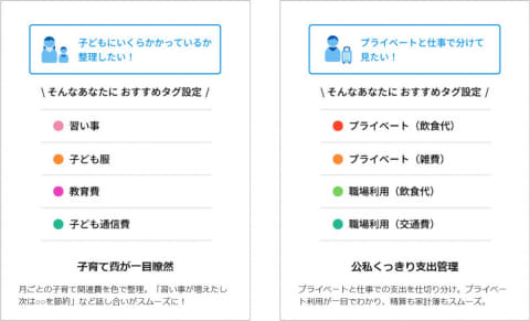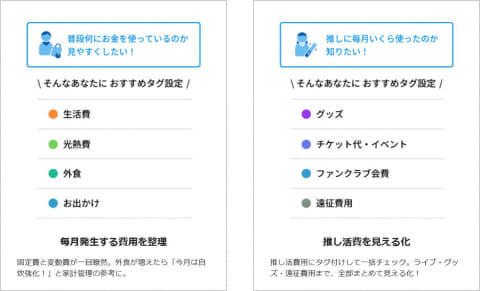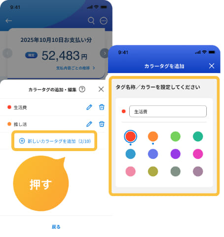 自身でカラータグ分けすることで、毎月何にいくら使ったか、支払いの傾向や内訳を確認可能。タグは自分好みにカスタマイズでき、最大10種類のカラータグで分類できる。最初に好きなタグを選び、後からタグの追加・編集も可能。