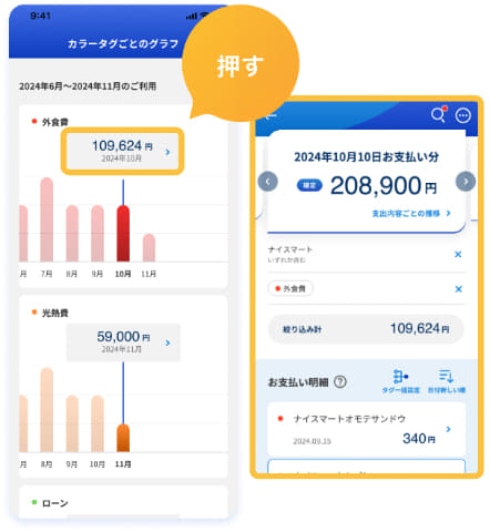 カラータグごとに毎月の利用金額推移のグラフ表示や、対象明細の絞り込み表示が可能。