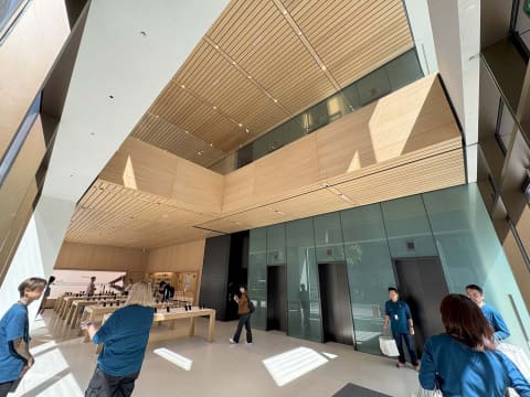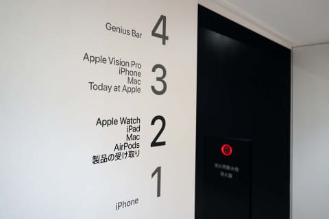 店舗は4フロアから構成され、1階はiPhoneと関連アクセサリー、2階はApple WatchとiPad、製品受け取りの「ピックアップ」、3階はMacとApple Vision Pro、4階がジーニアスバー(Genius Bar)となる。