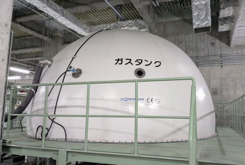 その後、生ごみは酸素を含まない環境のバイオマス発酵槽で分解。これにより生成されたバイオガスをガスタンクに貯蔵し、温水ボイラーで燃焼してお湯に利用される。