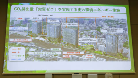 報道関係者向け説明会では、高輪ゲートウェイシティにおけるエネルギー活用戦略が紹介された。高輪ゲートウェイシティでは、2050年までのCO2排出量実質ゼロを目標に掲げており、バイオガスだけでなく水素や再生可能エネルギーを活用し、先進的な環境エネルギー技術を取り入れている。
