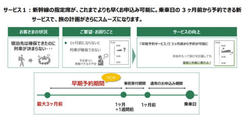 「えきねっと」においては、10月31日14時から、新幹線の指定席3カ月前予約が可能な「早期予約」サービスの申込を開始。26年1月10日以降の乗車分の予約が行なえるようになる。これまでは、1カ月前から予約開始だったため、より先の予定をおさえられるようになる。ただし、2025年度の年末年始期間は対象外となる。