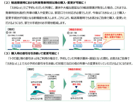 10月2日からは、新幹線や在来線の輸送障害時に「えきねっと」上で、発車時刻を過ぎた先行列車の指定席の購入や変更に対応する。運休や遅延などの影響で発車時刻を過ぎた列車については、これまでは駅に停車していても予約できなかったが、新規の購入や予約変更が行なえるようになる。