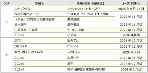 9月26日にスターバックスコーヒーがオープン。11月にペットの専門店コジマ、中華食堂 日高屋、ピラティスKなどがオープン。クリニックや調剤薬局なども入居する。