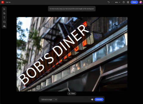 「画像内のテキストを編集(Beta)」は、Adobe Fireflyボードを離れることなく、コンテキストに合わせてビジュアル内のテキストを直接置き換えたり更新できる機能。作業の流れを中断せずに、試行・調整を行なえる。