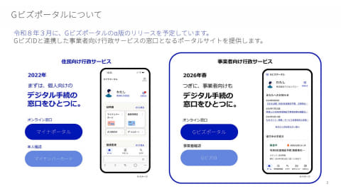 デジタル庁は26日、事業者向けの「マイナポータル」的な役割を担うデジタルサービス「Gビズポータル」を発表した。2026年(令和8年)3月のα版リリースを予定しており、「GビズID」と連携した事業者向け行政サービスの窓口となるサービスを構築する。