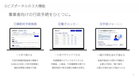 Gビズポータルでは、行政手続棚卸調査等の情報や、行政手続情報、補助金情報などを横断的に検索できるほか、新たに「電子ロッカー」に対応。申請手続きにおいて、申請者と行政書士等の士業者とのファイルのやり取り、行政機関への申請などもファイルベースで行なえるようになる。