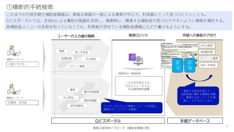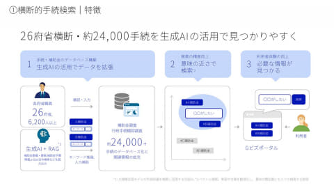 横断検索については、生成AIを活用してサービスを構築。26府省を横断し、2.4万の手続きの情報を一気通貫して、検索できるようにする。加えて、生成AIを活用し、各省の持つ資料等にタグ付けを行ないながら、検索・表示する情報を補完。わかりやすく手続きの内容などを紹介する。
