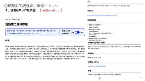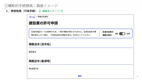 AI実証モードの実例として、建設業の許可申請の場合、AI実証モード「OFF」の場合は、根拠法令の「建設業法」と「第5条第1項」しか表示されないが、「ON」にした場合は、建設業許可に関する基本的な情報のほか、参照したURLや必要な提出書類、申請書に記載すべき情報などを含めて利用者に案内する。