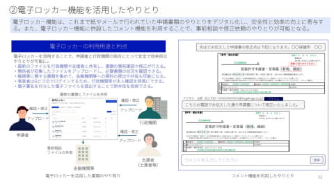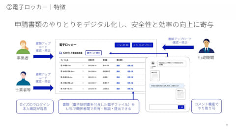 ロッカー上でのコメントのやり取りも可能。この取り組みにより、手続の電子申請率を向上させ、手続システムの費用対効果を改善するとともに、行政側の負担軽減を狙う。